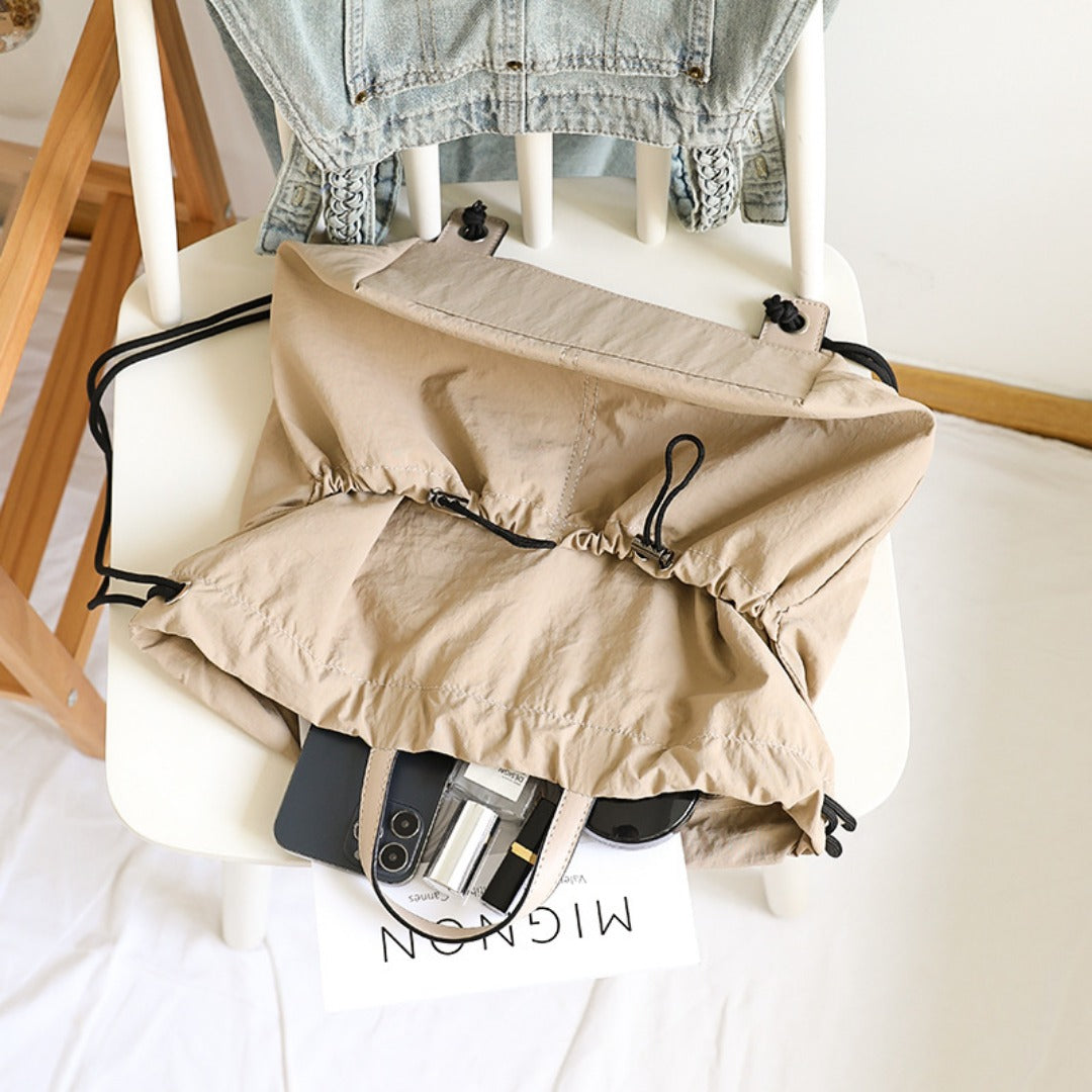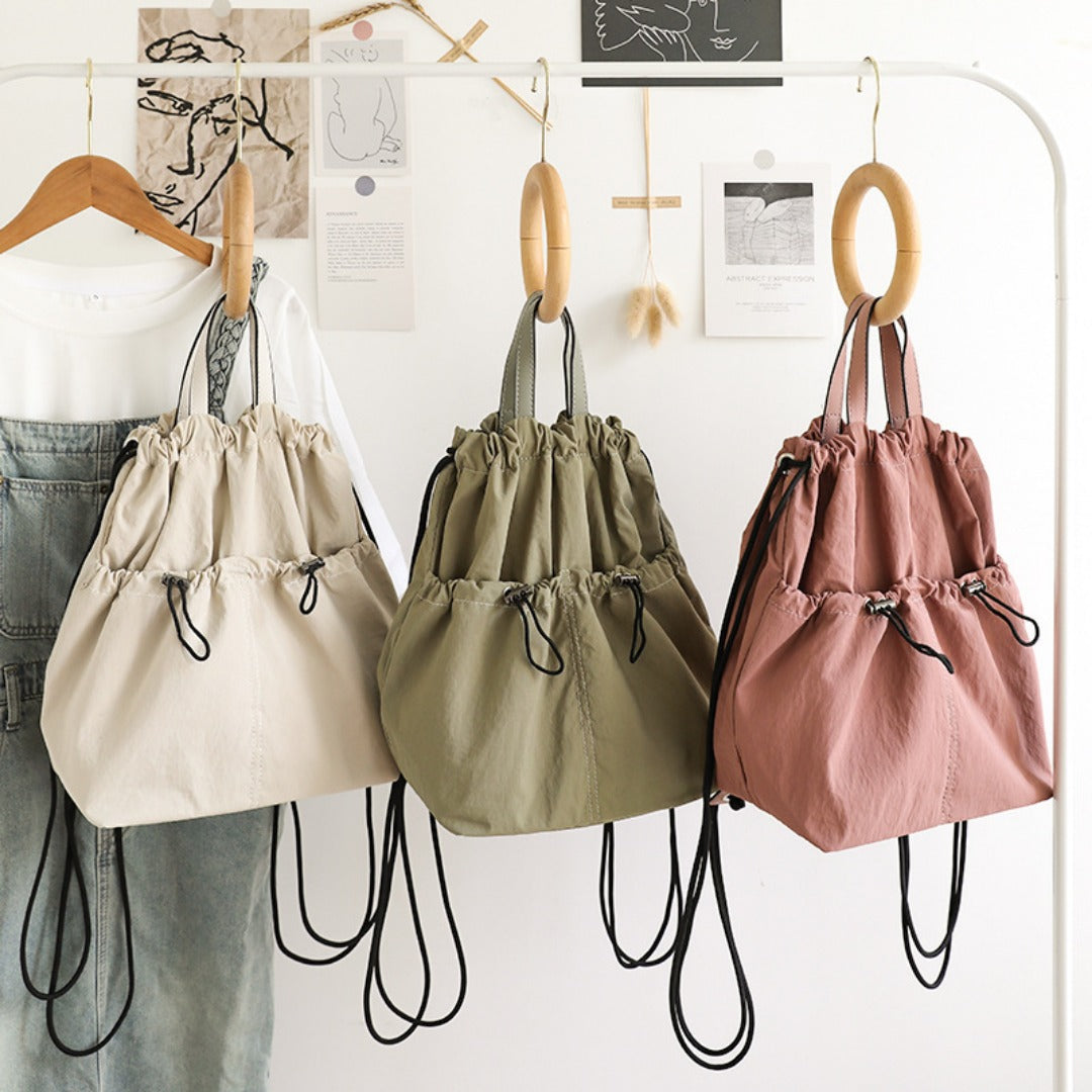 Mejora tu estilo diario con una elegante mochila unisex que combina la comodidad de un bolso tipo cubo con cordón y la estructura de una moderna mochila. Fabricada en nailon texturizado resistente, ofrece un rendimiento duradero y un aspecto refinado y minimalista. Su diseño ligero y sus correas ergonómicas la hacen cómoda para ir al trabajo, ir de compras, viajar y disfrutar de salidas informales.