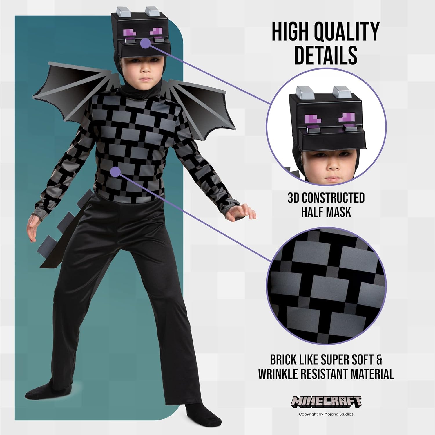 ¡Aparece en la dimensión del End de Minecraft con este disfraz clásico de Dragón de Ender! El disfraz incluye la cabeza, la capucha y el mono del Dragón de Ender, con alas y cola desmontables con detalles de paneles con púas.