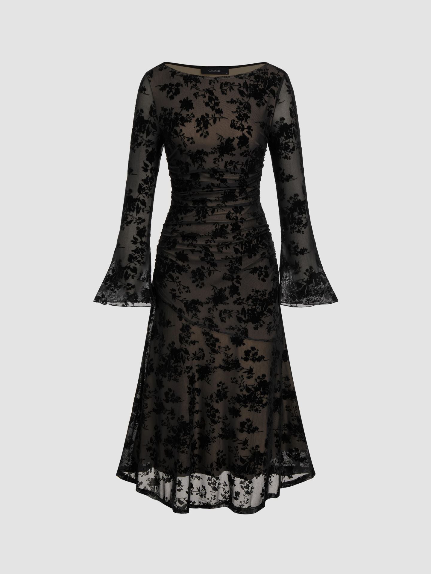 Un sofisticado vestido midi con estampado floral desgastado. Su cuello redondo y mangas largas lo hacen perfecto para el clima de transición, ofreciendo una combinación de cobertura y estilo.