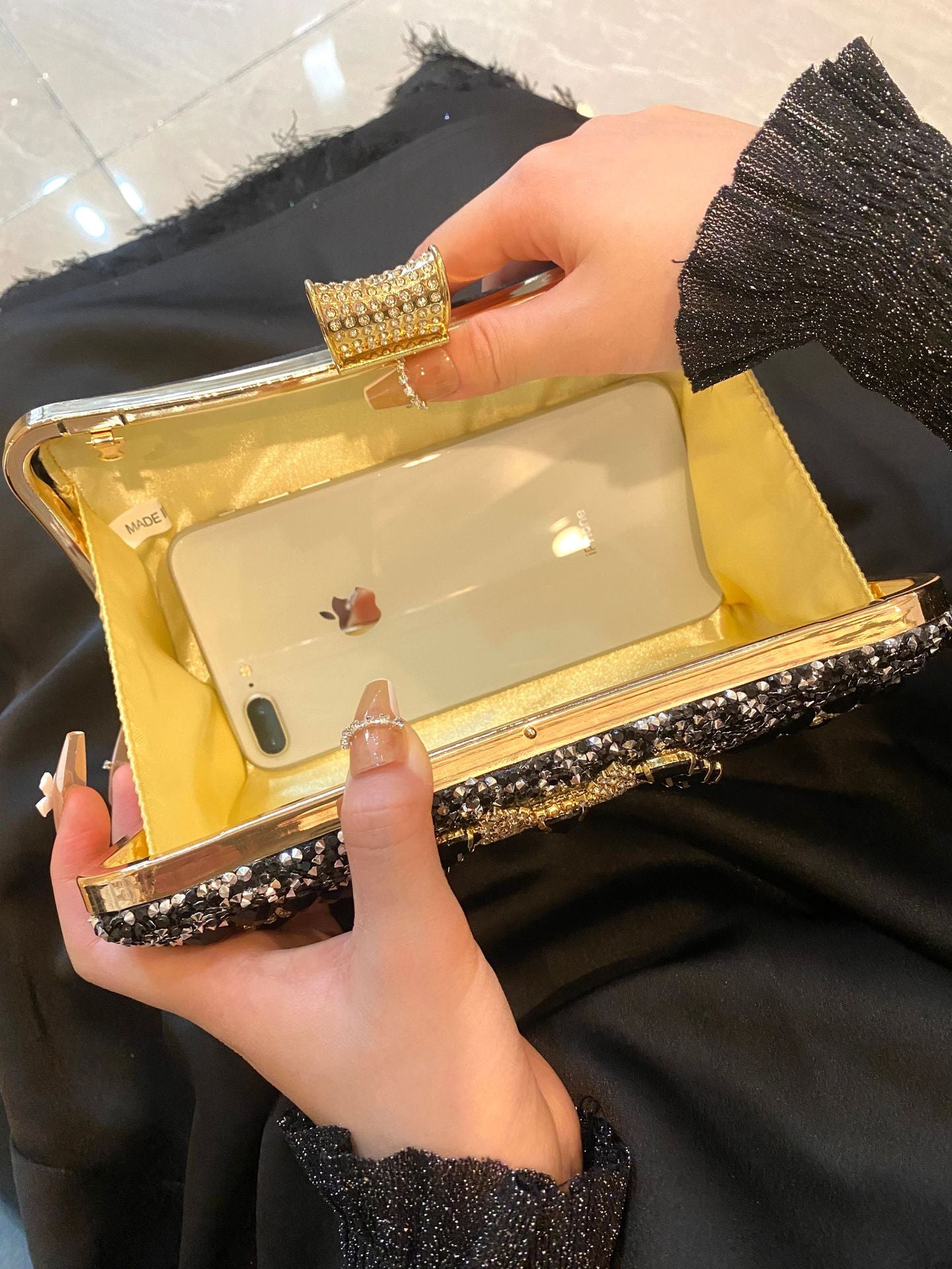 Este elegante bolso de mano para la cena tiene una textura con asas metálicas adornadas con varios diamantes negros.