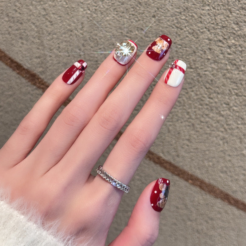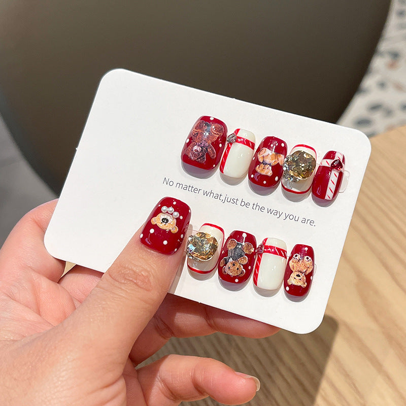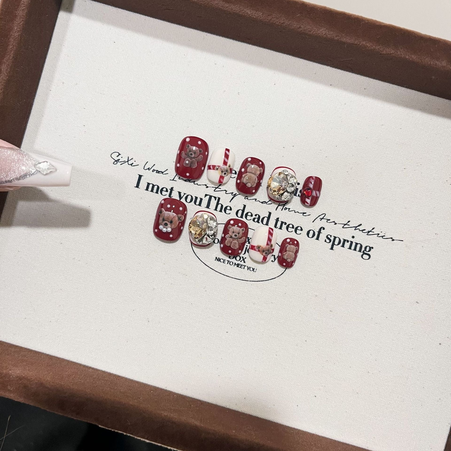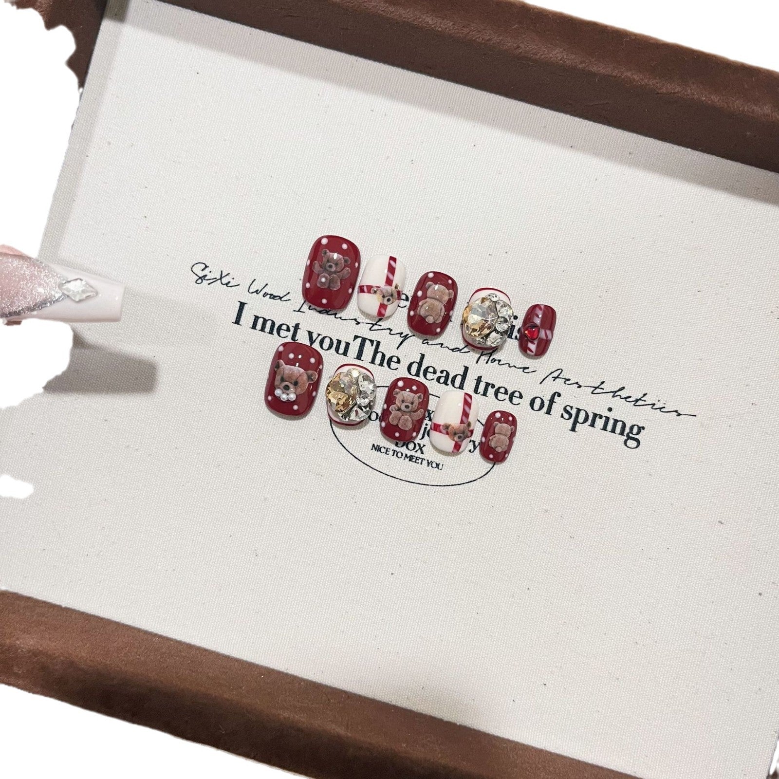 Armadura roja navideña hecha a mano de Año Nuevo, oso de dibujos animados, linda armadura con parche de uñas de otoño e invierno hecho a mano.