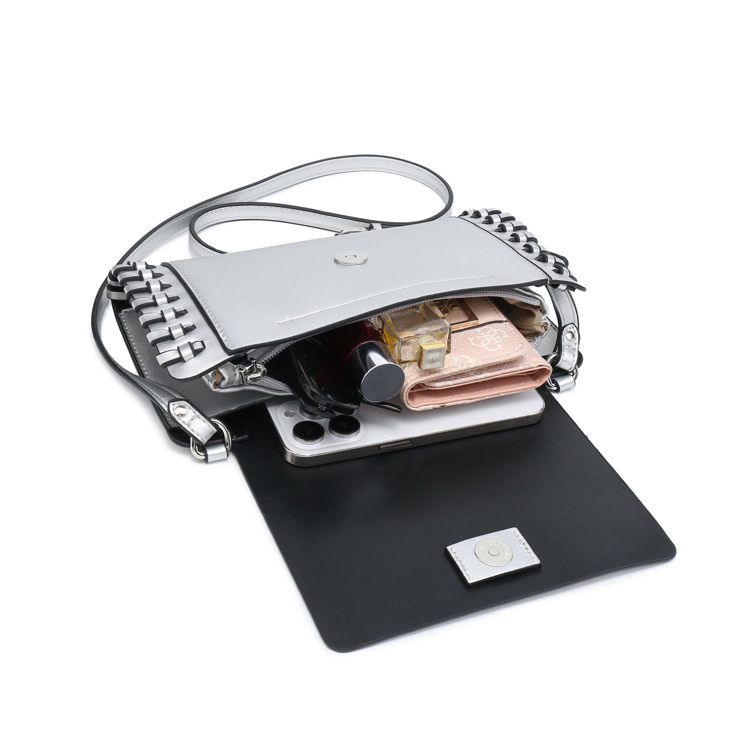 Bolso bandolera pequeño plateado, bolso cuadrado compacto color canela y negro con detalle de tejido artesanal.