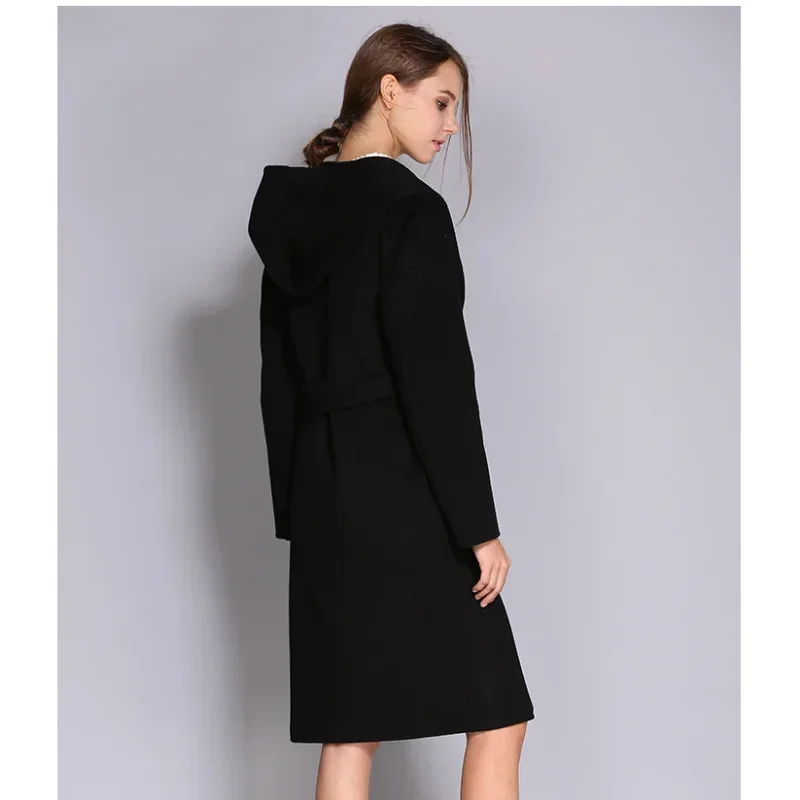 Abrigo de lana y cachemir de doble faz para mujer - Abrigo largo con capucha, sin botones y de largo medio con diseño de cordones