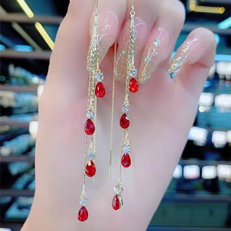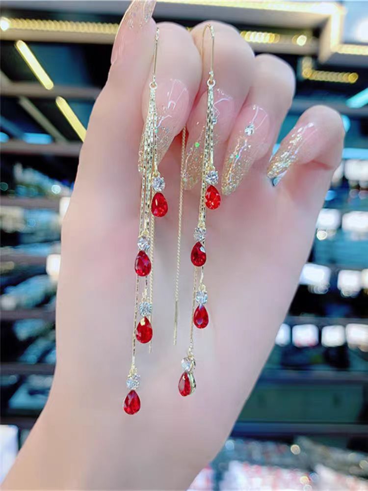 Sophisticated and fluid green crystal ear threads. These long, dangling earrings with green raindrop crystals create a slimming and elegant effect.