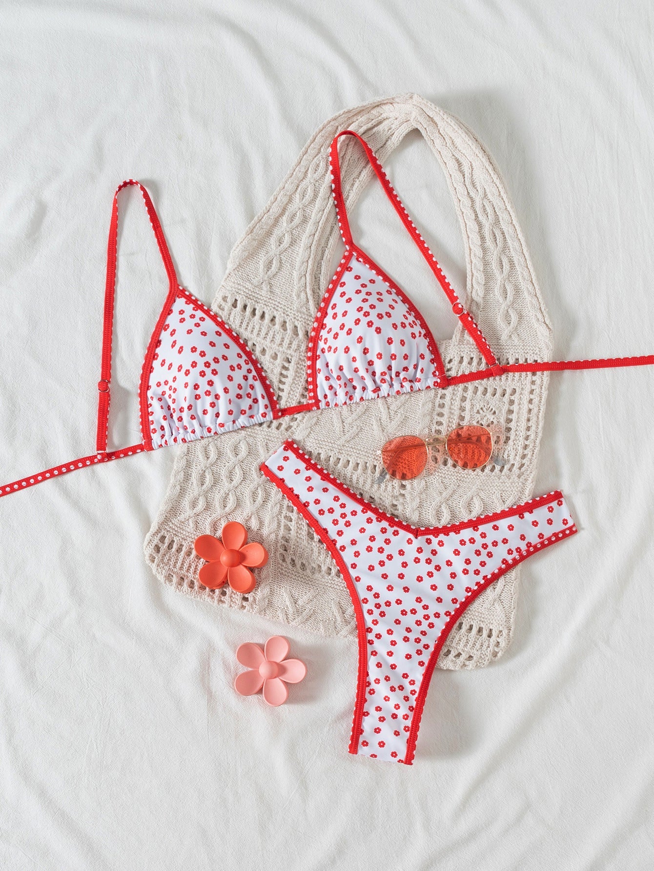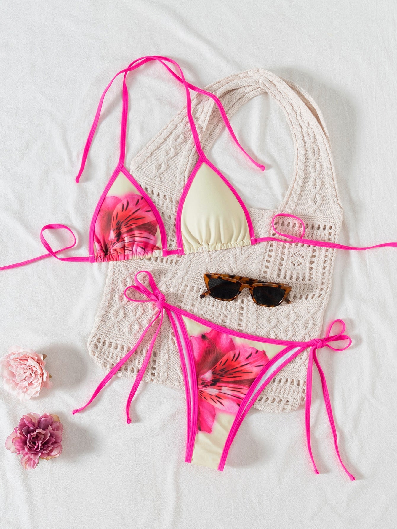 Contrasting Print Strap Sexy Bikini Split Swimsuit Batwing Short Sleeve Shirt W Plants Print two pieces