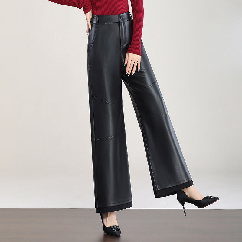 Make a powerful fashion statement with these high-waisted wide-leg leather pants. The relaxed, straight fit is both comfortable and chic, creating a long, lean silhouette.