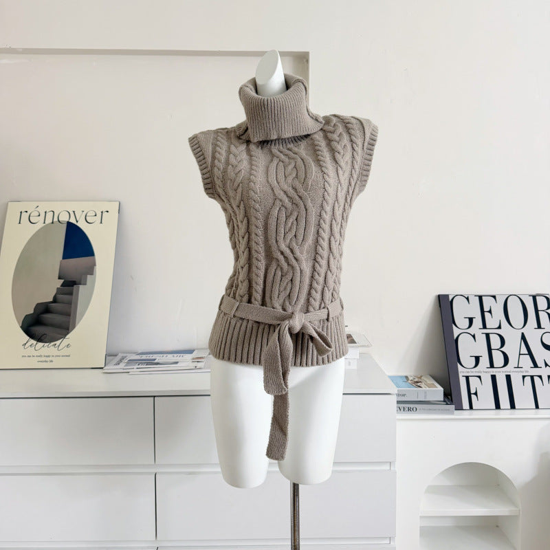 Thick needle knitting three-dimensional twist turtleneck small flying sleeve belt twisted sweater vest